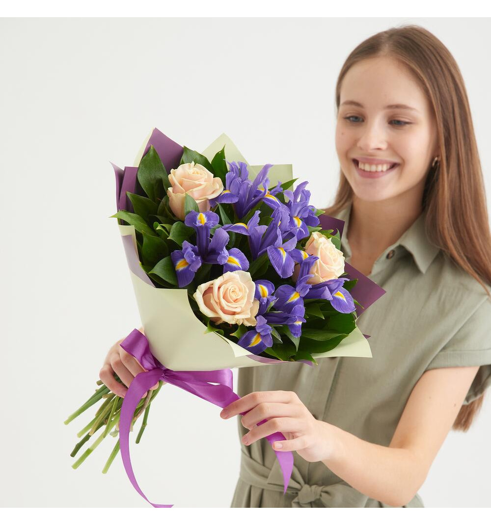 Ирисы и 3 розы нежного оттенка - это чудесное сочетание изящности и романтики. Ирисы своими насыщенными цветами и изящными формами придают букету особый шарм, а нежные розы добавляют ему романтичности и нежности. Этот букет станет прекрасным подарком для вашей возлюбленной или любимого, а также замечательным способом выразить свои чувства и эмоции. Его красота и изысканность точно поразят и подарят радость вашему получателю. Этот букет подчеркнет особенные моменты в жизни и создаст атмосферу нежности и умиротворения. Пусть эти прекрасные цветы подарят вам моменты счастья и вдохновения.