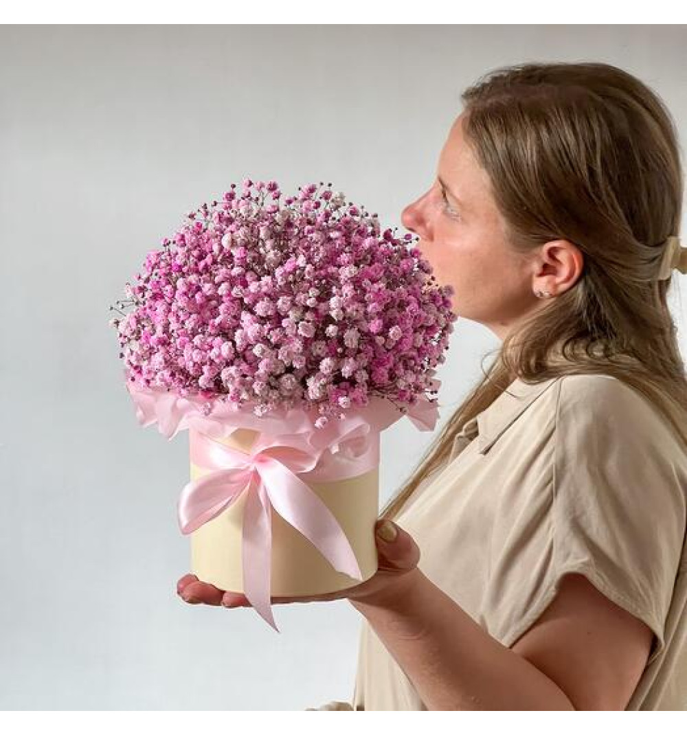 Этот изящный букет очаровывает своей нежностью и легкостью. Розовая гипсофила, также известная как "миллион маленьких звезд", создает впечатление мягких облачков розового цвета, придающих букету романтический и воздушный вид. Шляпная коробка добавляет элегантности и современности, а также обеспечивает удобство в поддержании свежести цветов. Этот прекрасный букет станет замечательным подарком для особенных моментов в жизни или просто чтобы порадовать близких и любимых.